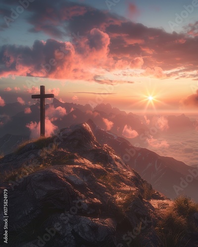 Cross over tombstone on the mountain peak with sunset background. 3d