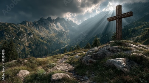 Cross rises majestically in mountain landscape under dramatic sky with piercing sunlight