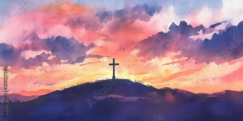 Cross Silhouette at Sunset: A serene watercolor painting captures a simple cross silhouetted against a vibrant sunset, symbolizing faith, hope, and spiritual reflection.
