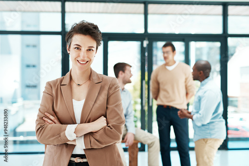 Crossed arms, office and portrait of business woman with confidence, leadership and company pride. Corporate worker, professional and happy person in workplace for career, job and working with team