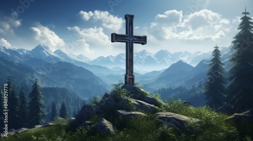 cross-gravestone in nature in the mountains. Symbol of religion of faith and memory