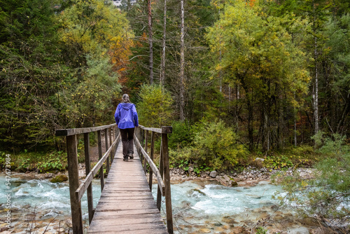 Crossing a wooden footbridge in the forest, somewhere in the Bistrice valley in the Triglav National Park