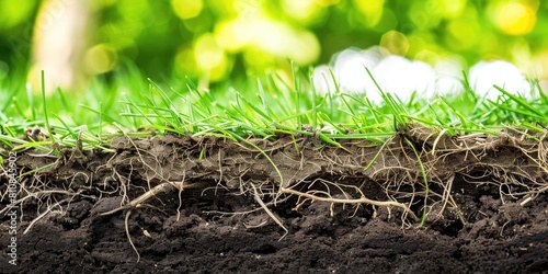 Cross-section of green grass turf with visible soil layers and roots. The healthy grass blades contrast with the dark soil beneath, creating a vibrant natural scene with a blurred bokeh background.