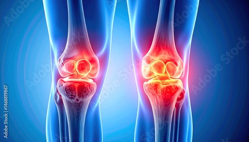 Cross-sectional anatomical image of damaged knee cartilage, with intra-articular inflammation highlighted in red