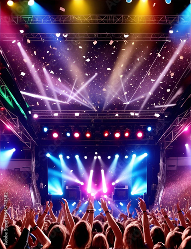 Crowd at a concert with hands up. Scene stage lights, rock festival.