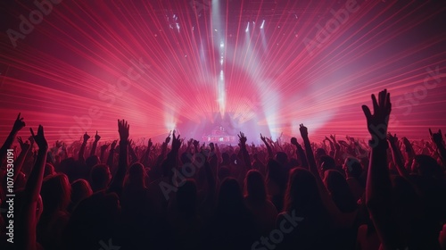 Crowd cheering at a music festival with vibrant stage lighting and colorful lasers hands raised in excitement