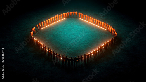 Crowd gathers in circular formation, illuminated by glowing lights, creating striking visual
