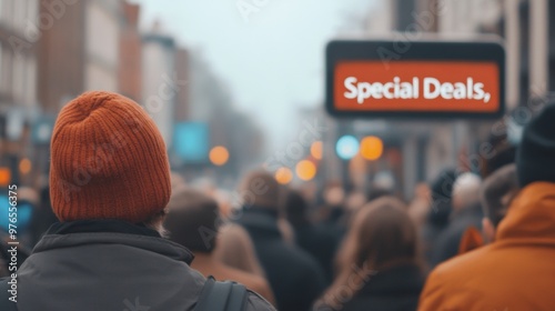 Crowd in Local Market Listening to a Speaker Under Special Deals Sign in Urban Setting