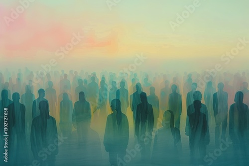 crowd of faceless silhouettes gathered in a vast, empty space. The figures stand shoulder to shoulder, their outlines blending seamlessly into one another, symbolizing the universal human experience