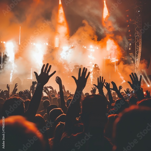 Crowd of fans at a rock concert, hands raised, enjoying live music, dynamic lighting with smoke effects.
