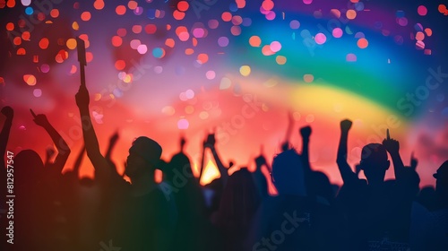 crowd of people are enjoying a concert at night. The stage lights are bright and colorful, and the crowd is cheering and waving their arms in the air.