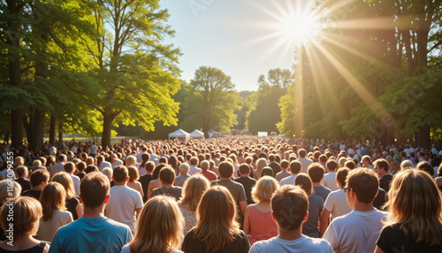 Crowd of people enjoying an outdoor event in a sunlit park
