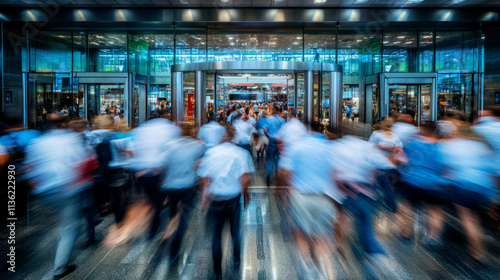 Crowd of people in front of shopping center, motion blur