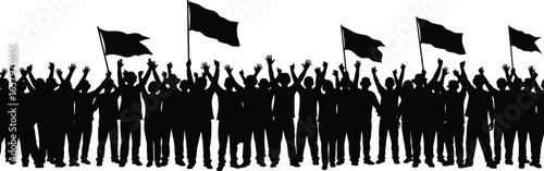 Crowd of people silhouette with raised hands and flags, cheering and protesting, vector graphic for event, rally, or celebration design