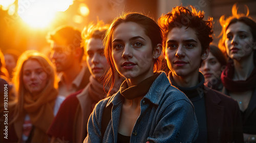 Crowd of young adults standing at sunset, serious expressions,international youth day