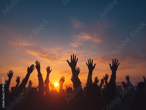 Crowd raising hands in celebration during sunset at an outdoor event in the evening sky