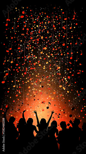 Crowd silhouetted against falling music notes orange and red hues create a vibrant and energetic atmosphere with bright