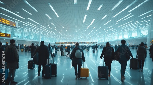Crowded airport terminal filled with travelers, bright overhead