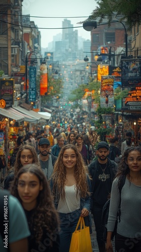 Crowded street market bustling with shoppers and vibrant shop signs in an urban area during late afternoon