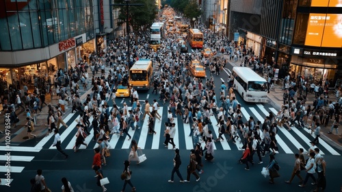 Crowded urban crosswalk with multiple pedestrians crossing streets surrounded by buses, taxis, and high-rise buildings during daytime in a bustling city.