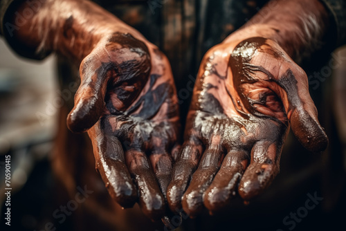 Crude oil production. Hands of worker in crude oil. Oil spilled in hands of worker during crude extraction. Oilfield Accident. Spilled petroleum products. Oil industry Crisis. Economic downturn