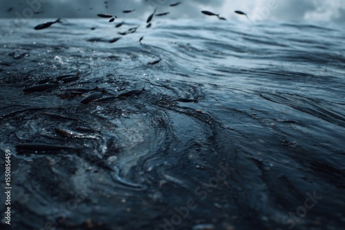 Crude oil spill in ocean, thick black oil floating on water surface, dead fish, polluted sea, environmental disaster, dark cloudy sky, high detail, documentary style, realistic texture.