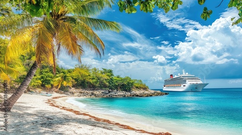 Cruise ship docked at a tropical island, with palm trees and white sand beaches in the background, offering a perfect vacation escape