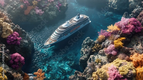 Cruise ship navigating coral reef channel, ocean