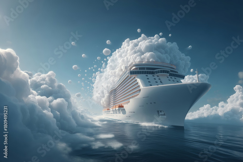 Cruise ship sailing beneath a cloud of viral symbols during pandemic times