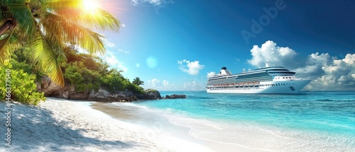 Cruise Ship Sailing Near a Tropical Island Beach Under Bright Sun and Clear Blue Skies