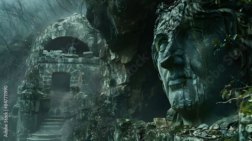 Crumbling Ancient Stone Archway Overgrown with Ivy and Moss in Lush Jungle Landscape
