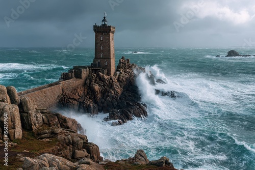 Crumbling lighthouse on rocky outcrop surrounded by stormy sea spray.