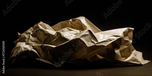 Crumpled kraft paper with dramatic lighting on dark background creating abstract textured design