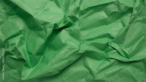 Crumpled vibrant green fabric texture with intricate folds and creases creating an abstract background