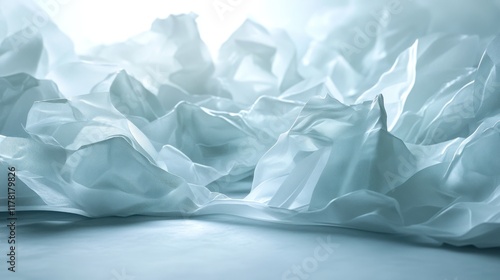 Crumpled white paper creates a textured landscape resembling icy mountains in soft lighting. Generative AI