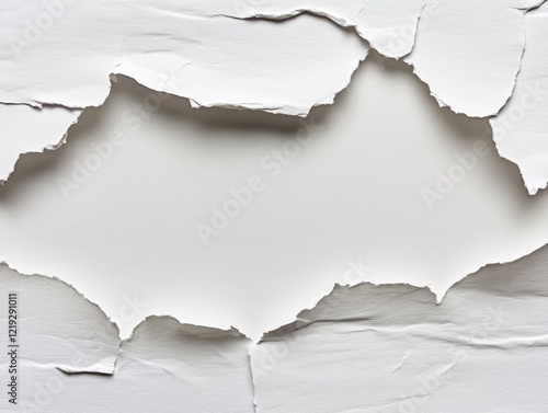 Crumpled white paper with torn edges on a white background. Textured and wrinkled surface creating a minimalist and natural design, perfect for abstract backgrounds, art concepts