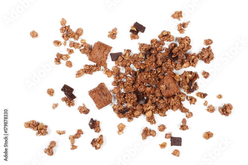 Crunchy granola, muesli pile with chocolate isolated on white background, top view