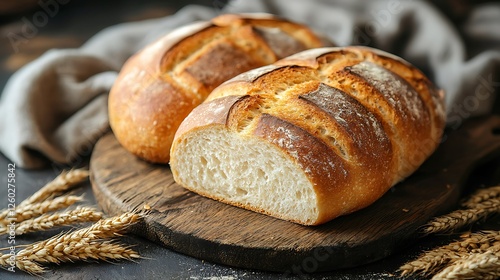 Crusty artisan bread loaf, sliced, rustic kitchen