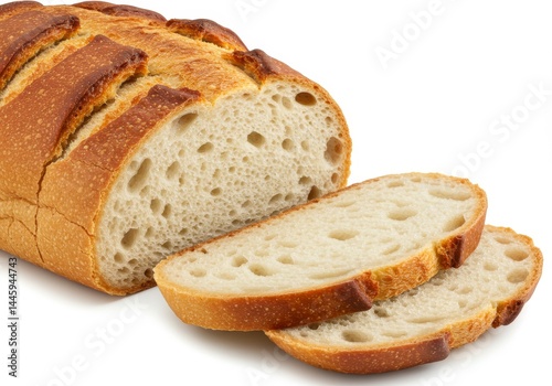 Crusty Artisan Bread Loaf Slices - Delicious crusty artisan bread loaf sliced, showing its airy interior. Perfect for sandwiches, toast or enjoying on its own