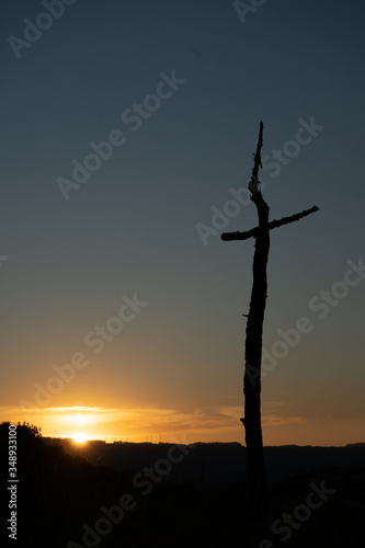 Cruz cristiana de madera. Árbol en un hermoso atardecer.
