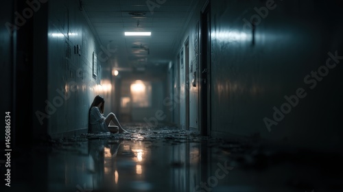 Crying girl empty hall photograph dimly lit perspective emotional reflection