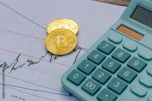 Cryptocurrency bitcoin coin, next to a graph of the evolution of cryptocurrencies