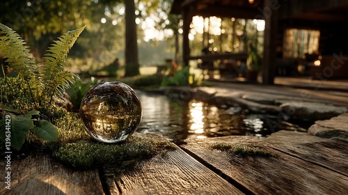 Crystal Ball Reflecting Waterfall Serenity Garden Wooden Deck Nature Scene
