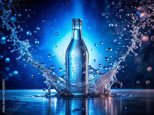Crystal Clear Bottle with Dynamic Water Splash on Blue Background - High-Resolution Stock Photo