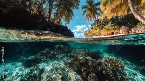Crystal clear waters reveal vibrant marine life beneath the surface. Lush palm trees frame the idyllic scene, inviting relaxation and exploration. Generative AI