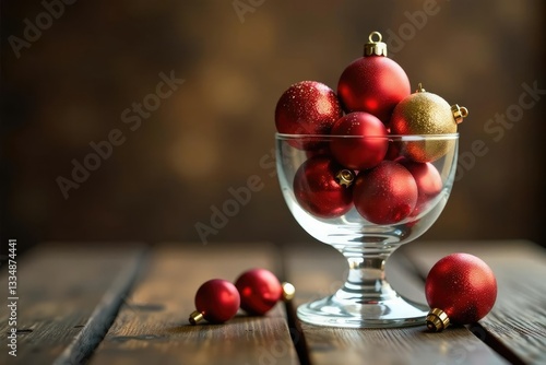 Crystal cup filled with red and golden Christmas balls on a wooden table, sparkling, glassware