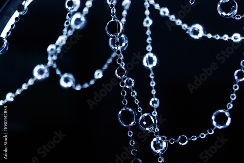 Crystal disco beads hanging garland shining on dark background. Christmas, New Year 2025