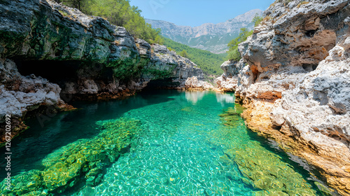 Crystal-clear river flows through mountain gorge; scenic background, travel brochure