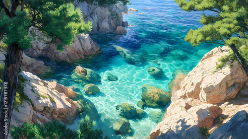Crystal-clear turquoise water fills a rocky cove, overhung by lush green pine branches. perfect for travel, nature, or summer themes; evokes serenity and escape. Shadow Cove. Illustration