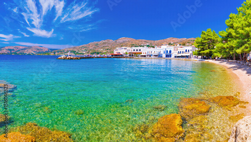 Crystal-clear turquoise waters gently lap against a sun-drenched shoreline, with whitewashed buildings and lush greenery completing the serene charm of a picturesque Greek island village.